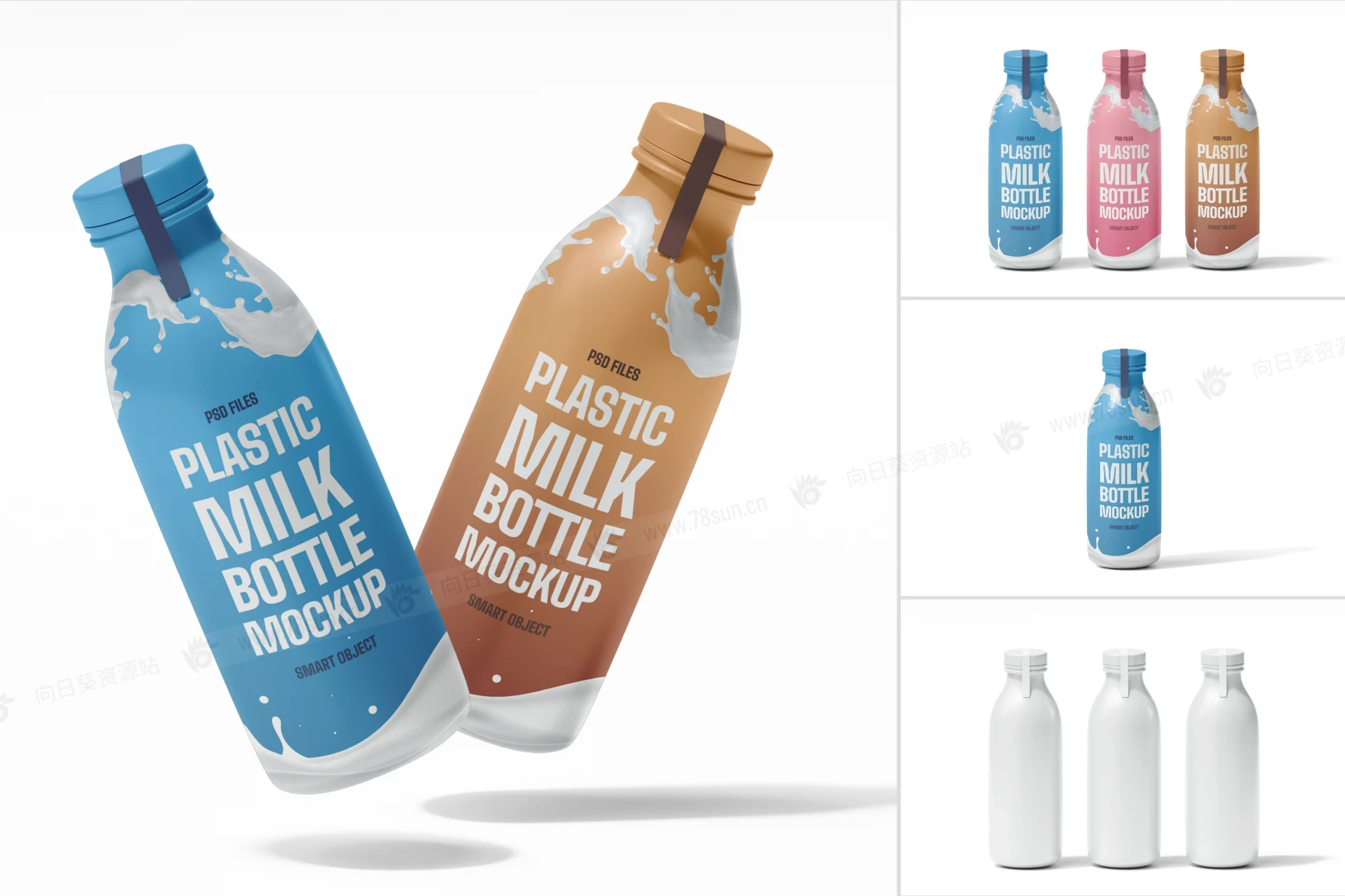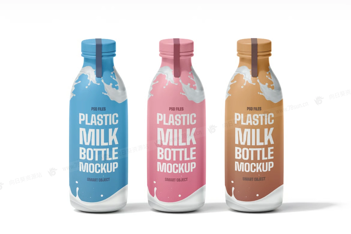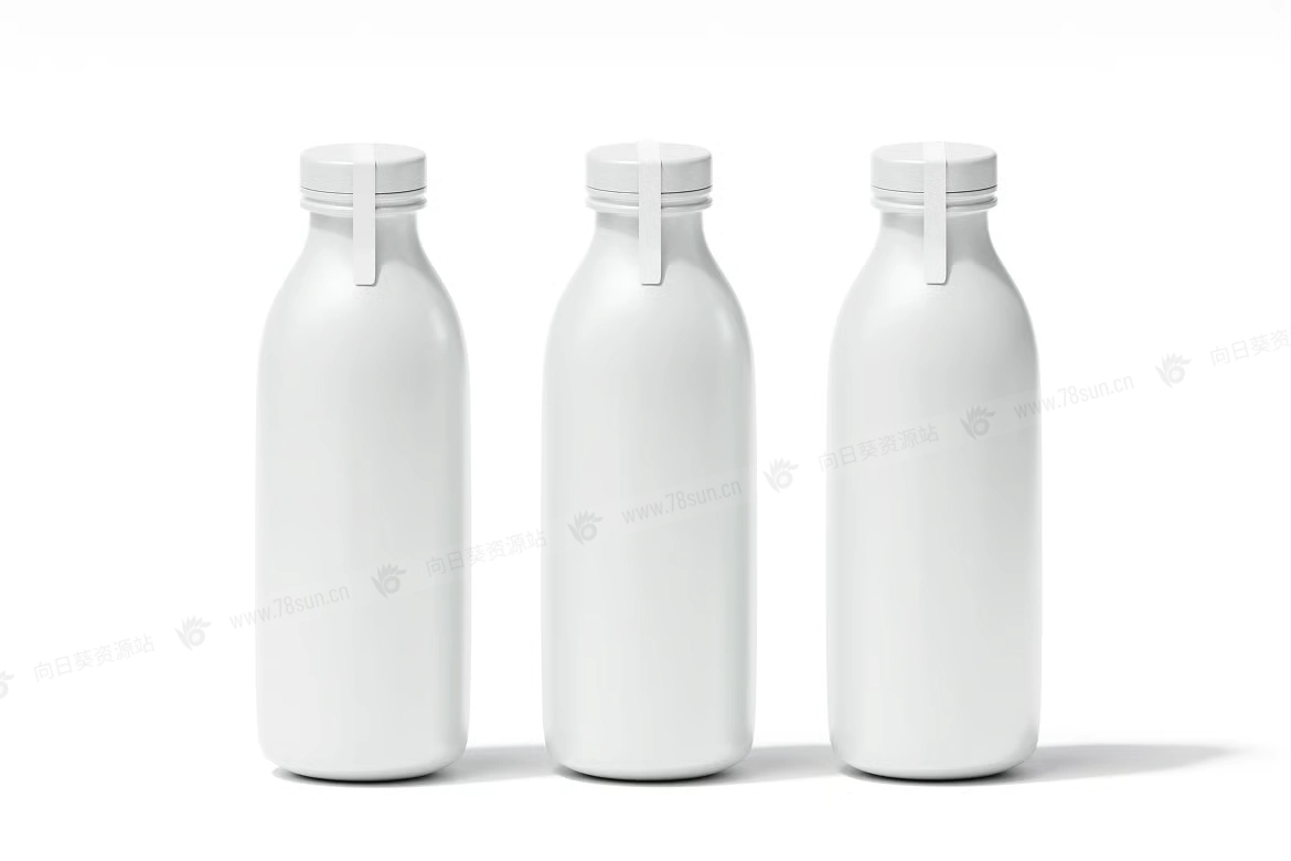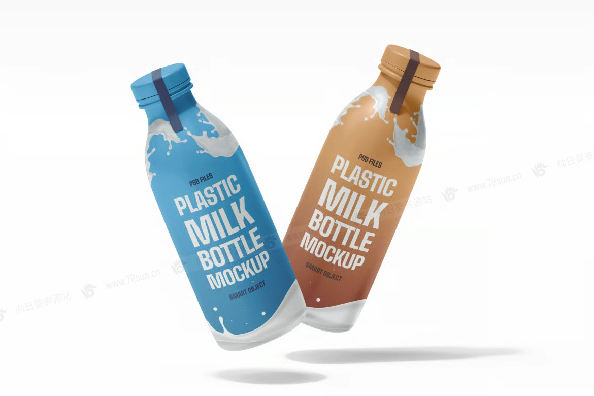 牛奶饮料瓶品牌VI效果图展示智能贴图psd设计样机,每个PSD文件都可以通过智能对象图层轻松编辑,实现快速定制。