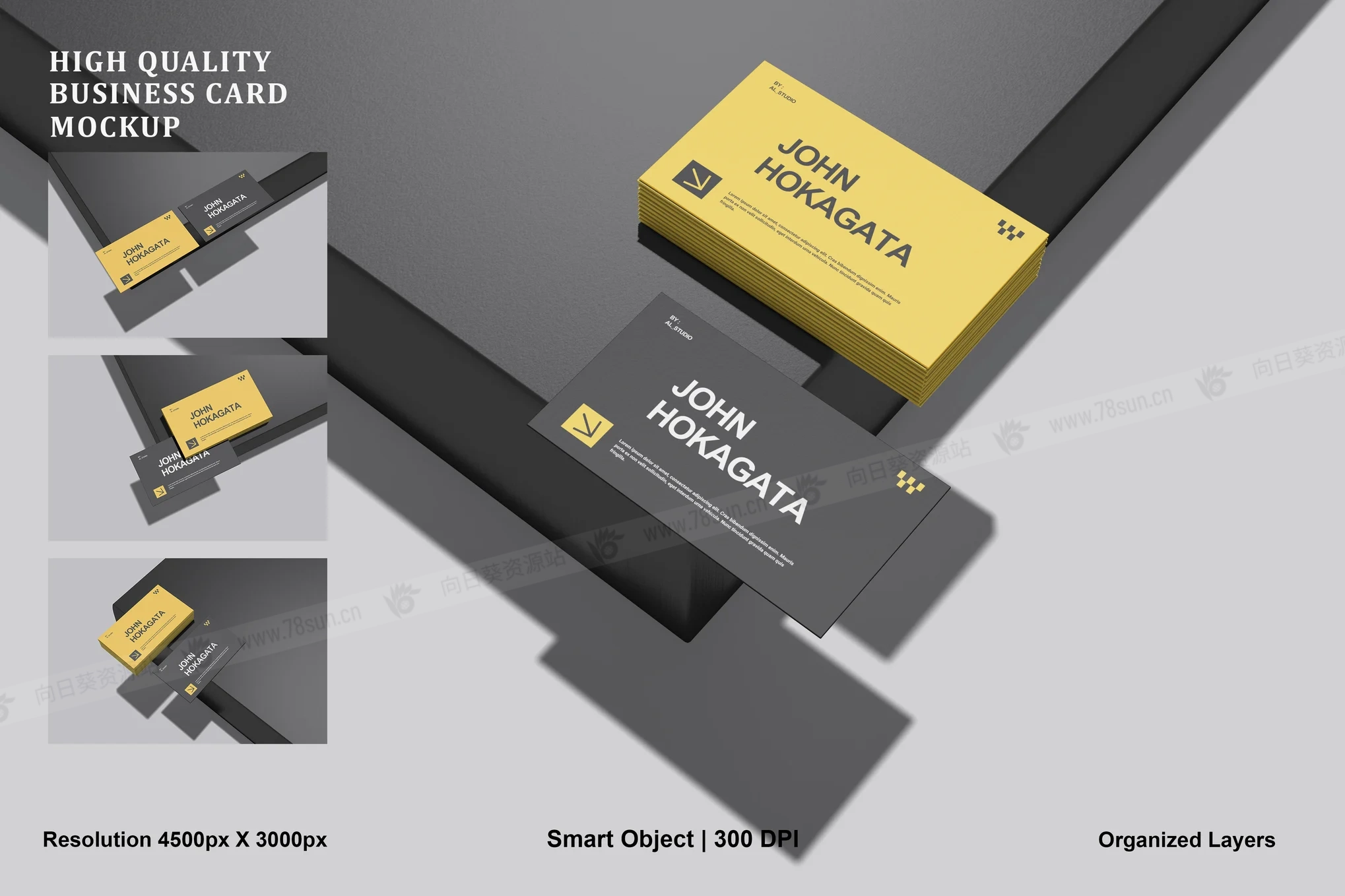 名片商业卡片品牌VI效果图展示智能贴图psd设计样机,这个模型包含4个带有分层良好的PSD文件,并且还采用了智能对象功能,这意味着你可以在几秒钟内轻松快速地用自己的设计替换当前设计。