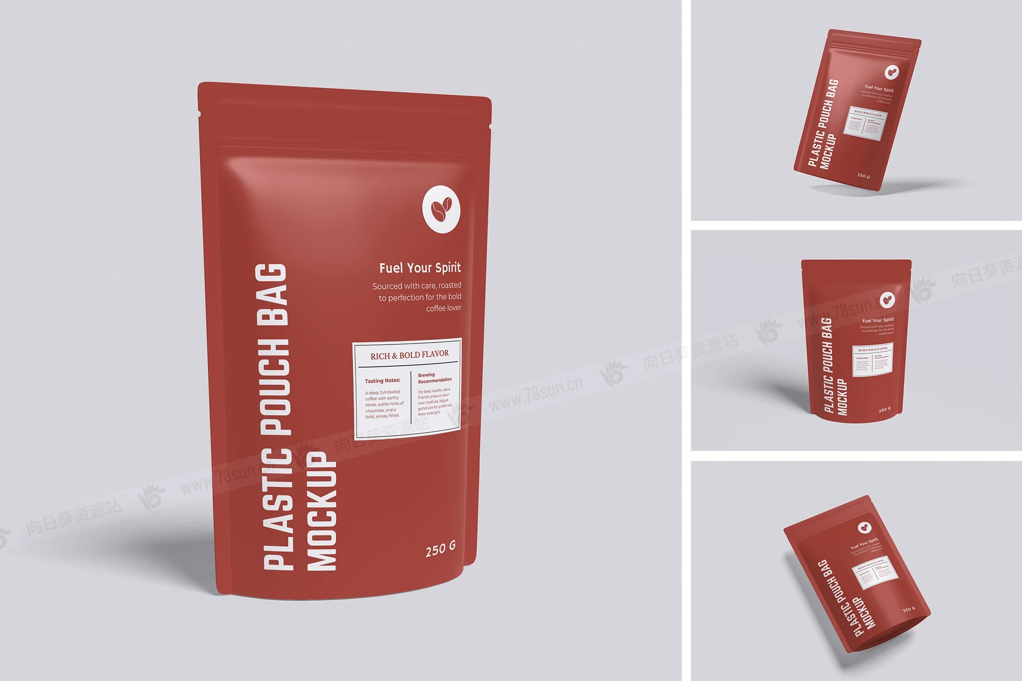 站立式拉链锁袋品牌VI效果图展示智能贴图psd设计样机,这个模型包含4个带有分层良好的PSD文件,并且还采用了智能对象功能,这意味着你可以在几秒钟内轻松快速地用自己的设计替换当前设计。
