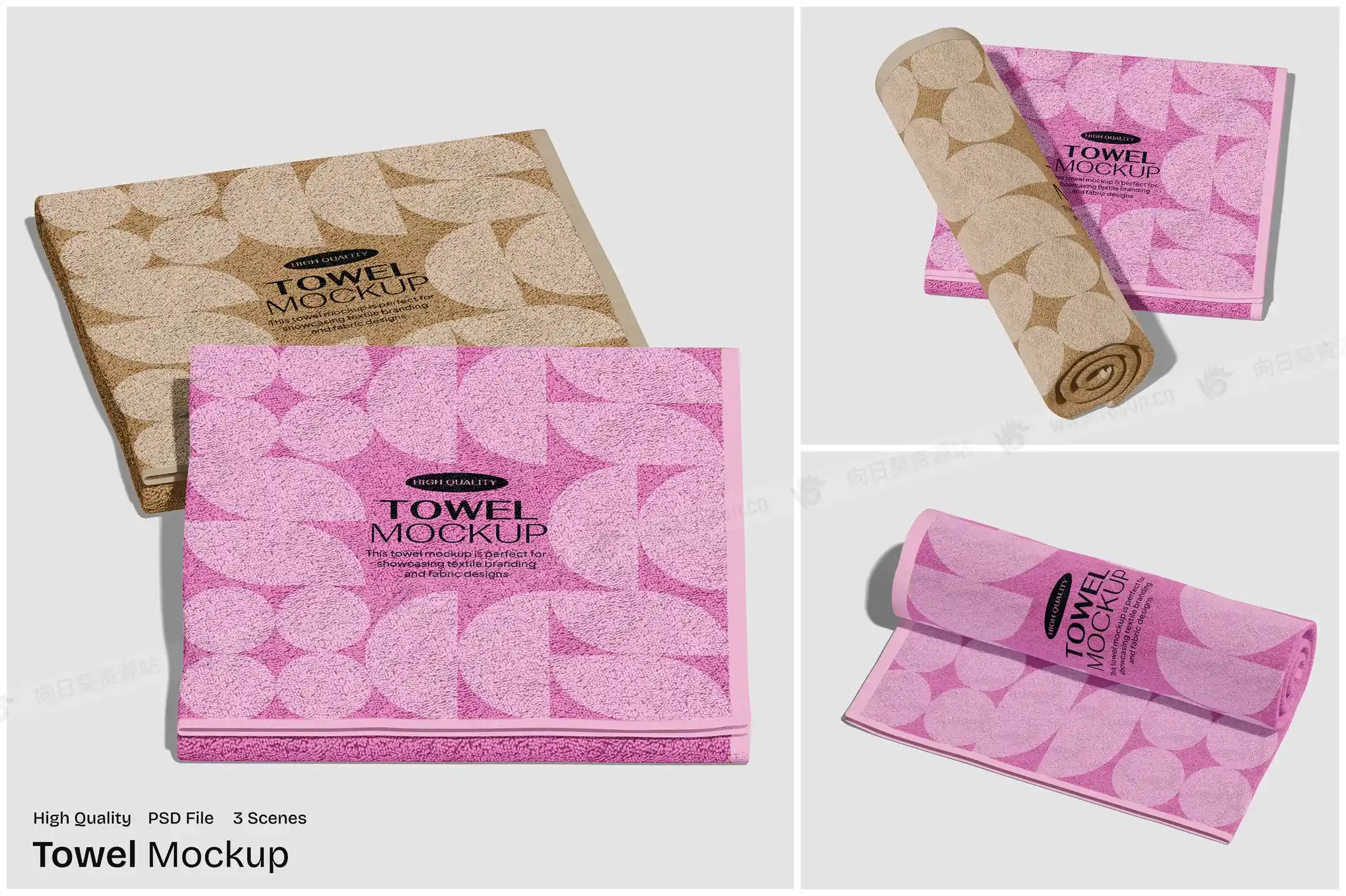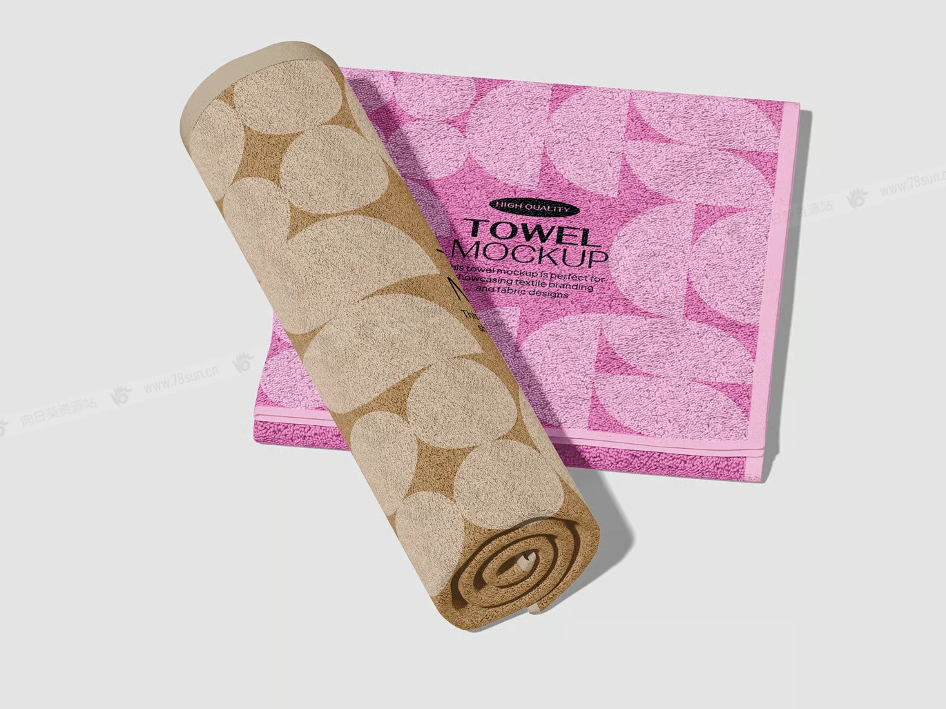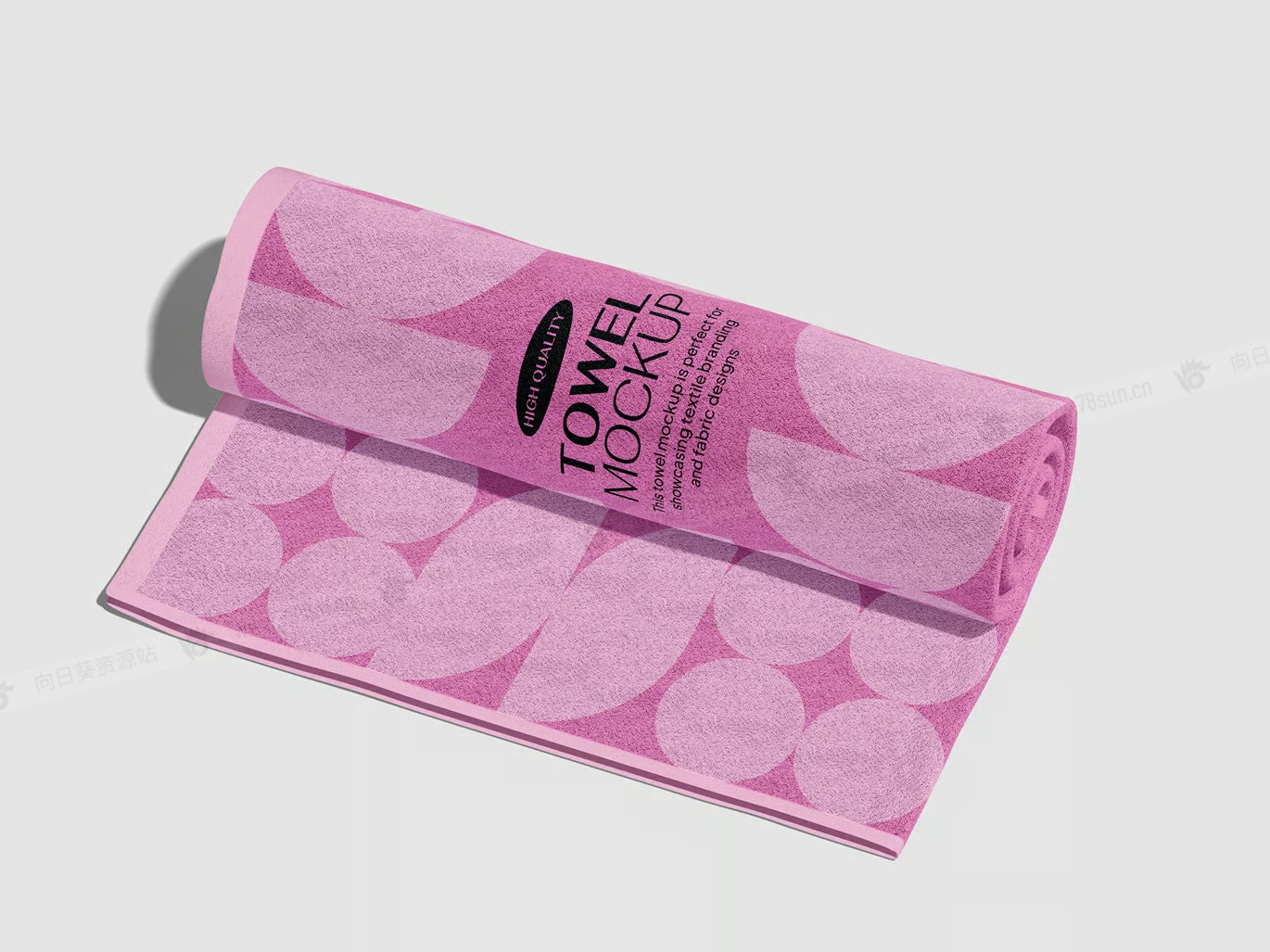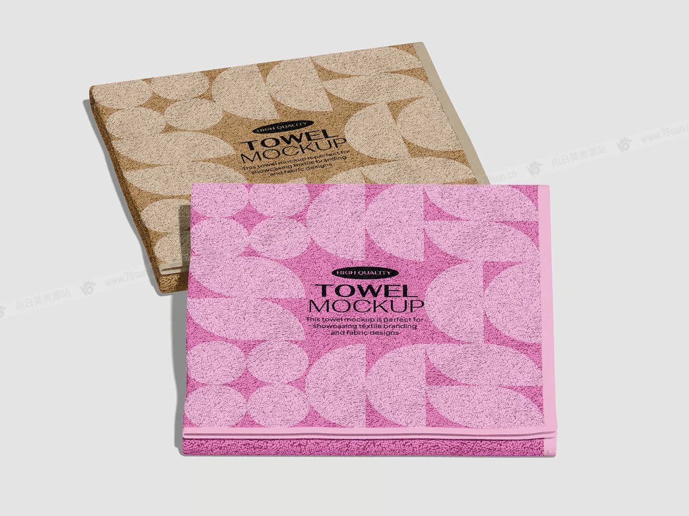 折叠毛巾品牌VI效果图展示智能贴图psd设计样机。这套模型突出了面料的质感、褶皱和清晰的标志位置。毛巾采用逼真的织法、自然折痕和柔和的灯光,增强了材质细节。通过智能物品插入你的设计,并调整毛巾颜色或背景色调以匹配你的品牌形象。