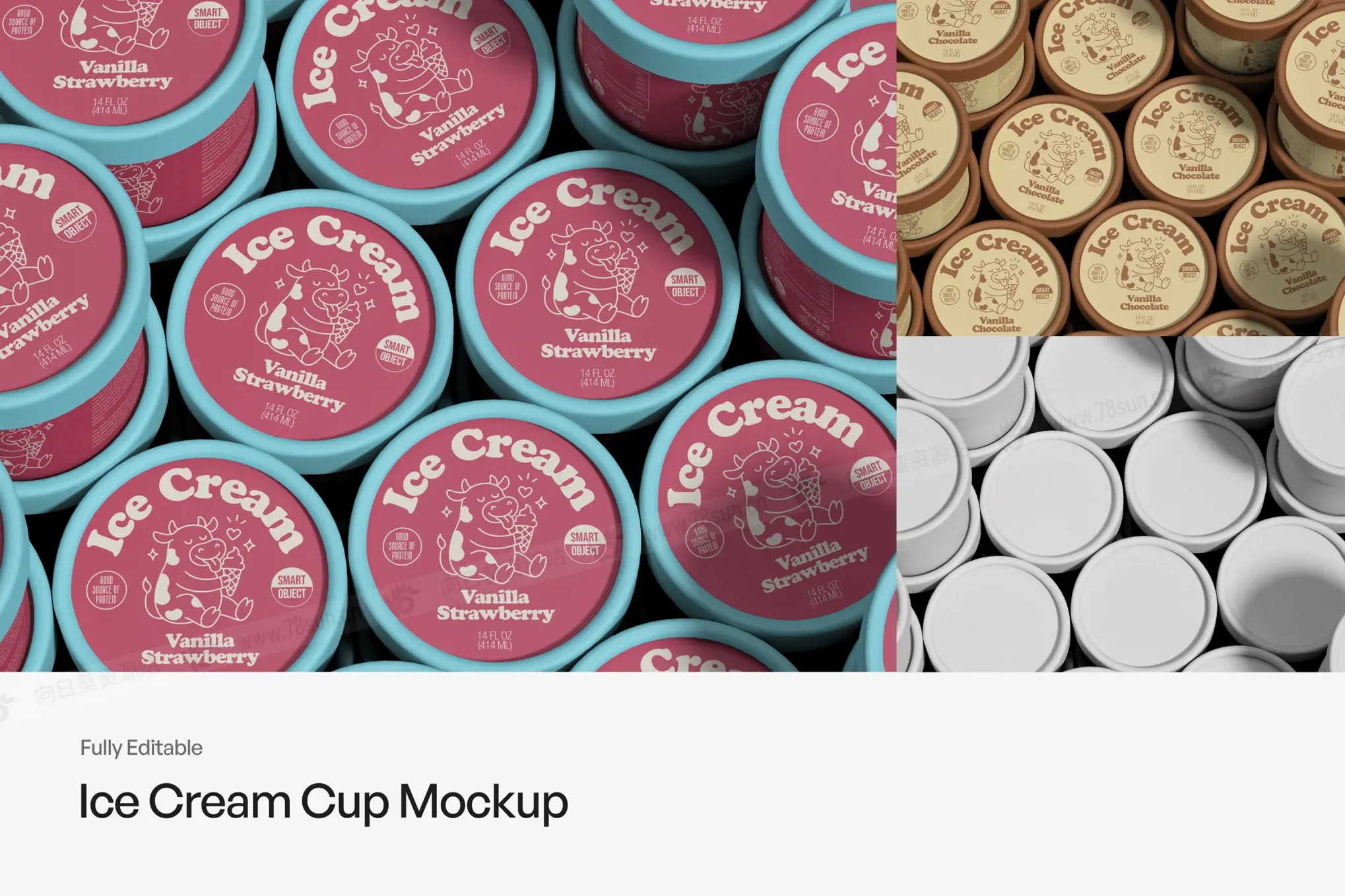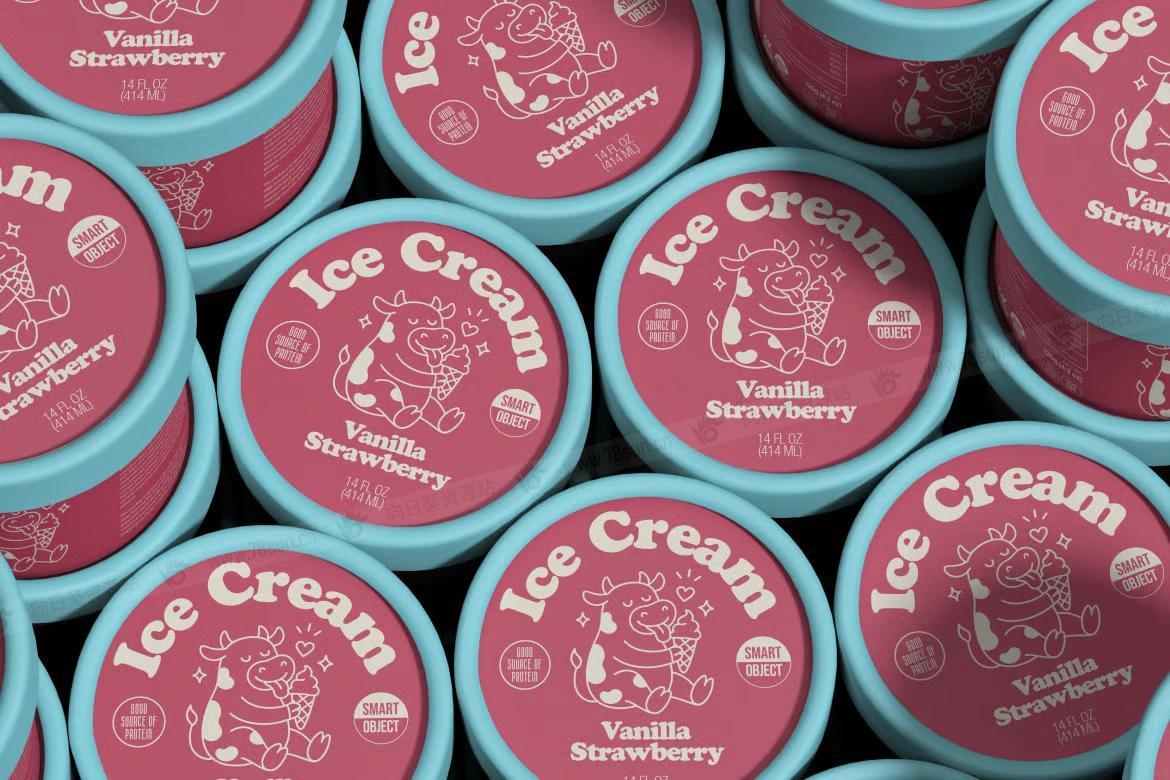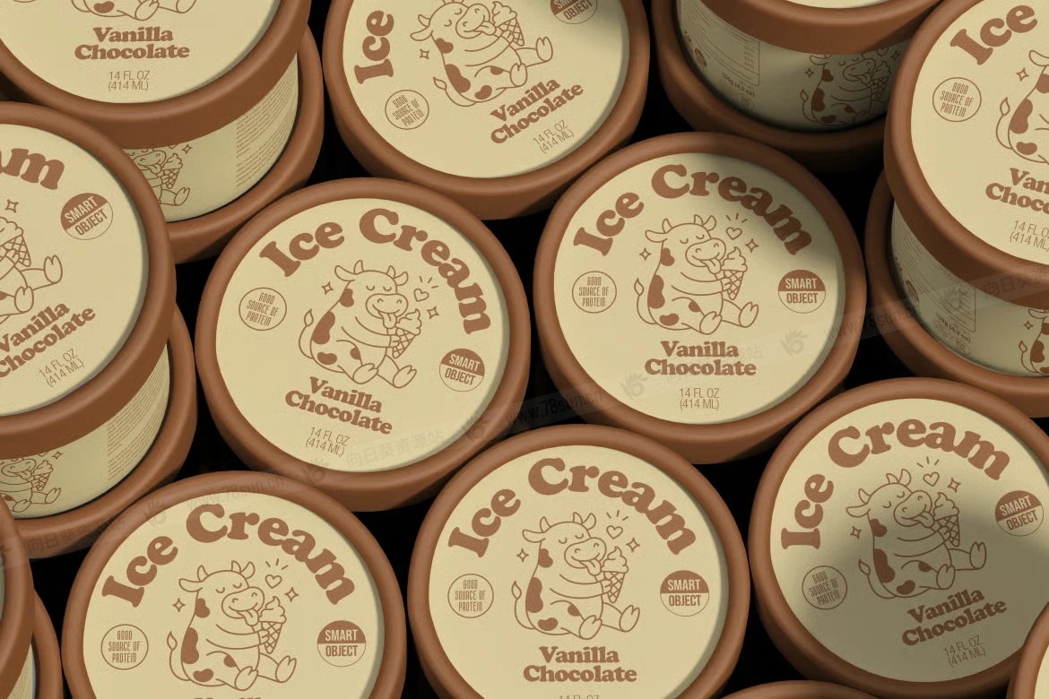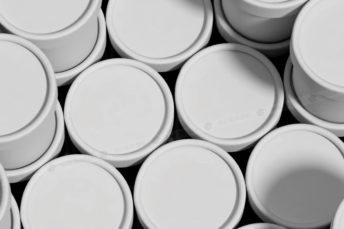 桶装冰淇淋纸杯品牌VI效果图展示智能贴图psd设计样机,场景中出现了多个冰淇淋杯物品以重复排列的图案。所有杯子大小和形状都相同,营造出干净整洁的外观。布局紧凑且略有重叠,这
