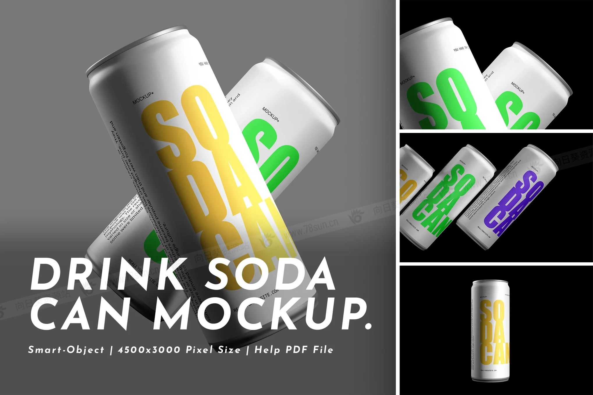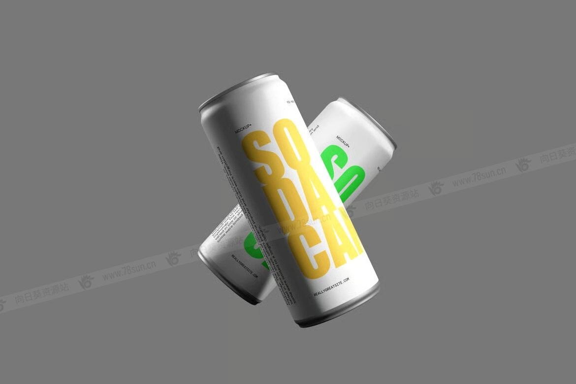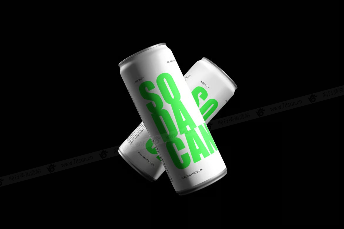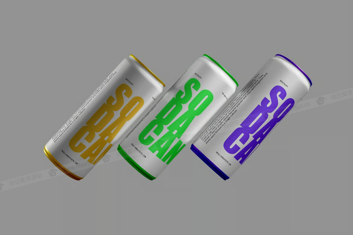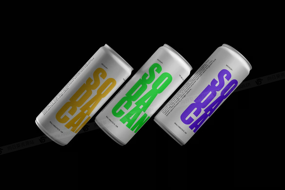 汽水饮料易拉罐头品牌VI效果图展示智能贴图psd设计样机。通过Photoshop中的智能对象功能,应用起来非常简单。所以,你可以在几秒钟内完成设计。模型由结构良好的图层组成。