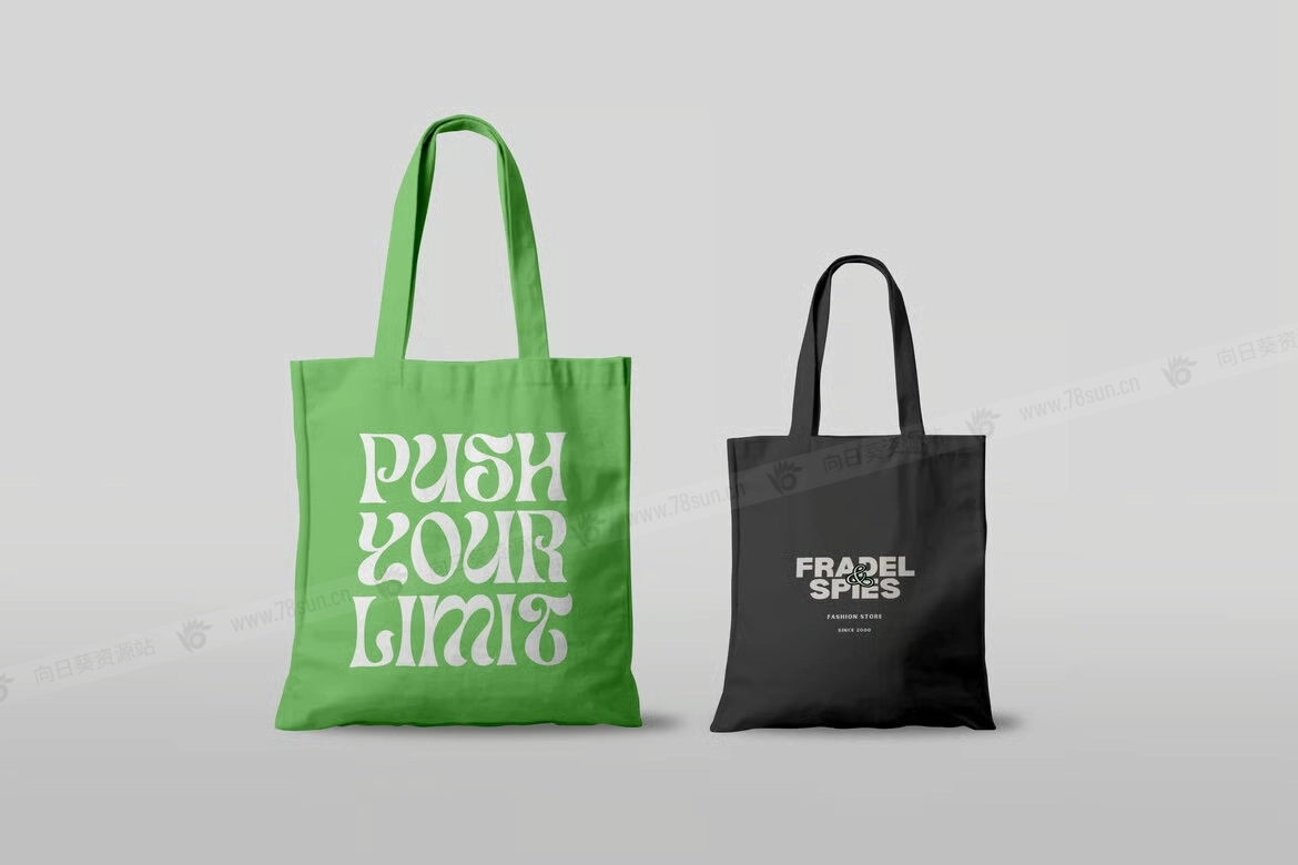 手提袋购物袋品牌VI效果图展示智能贴图psd设计样机。只需用智能物件拖拽设计,即可轻松定制。