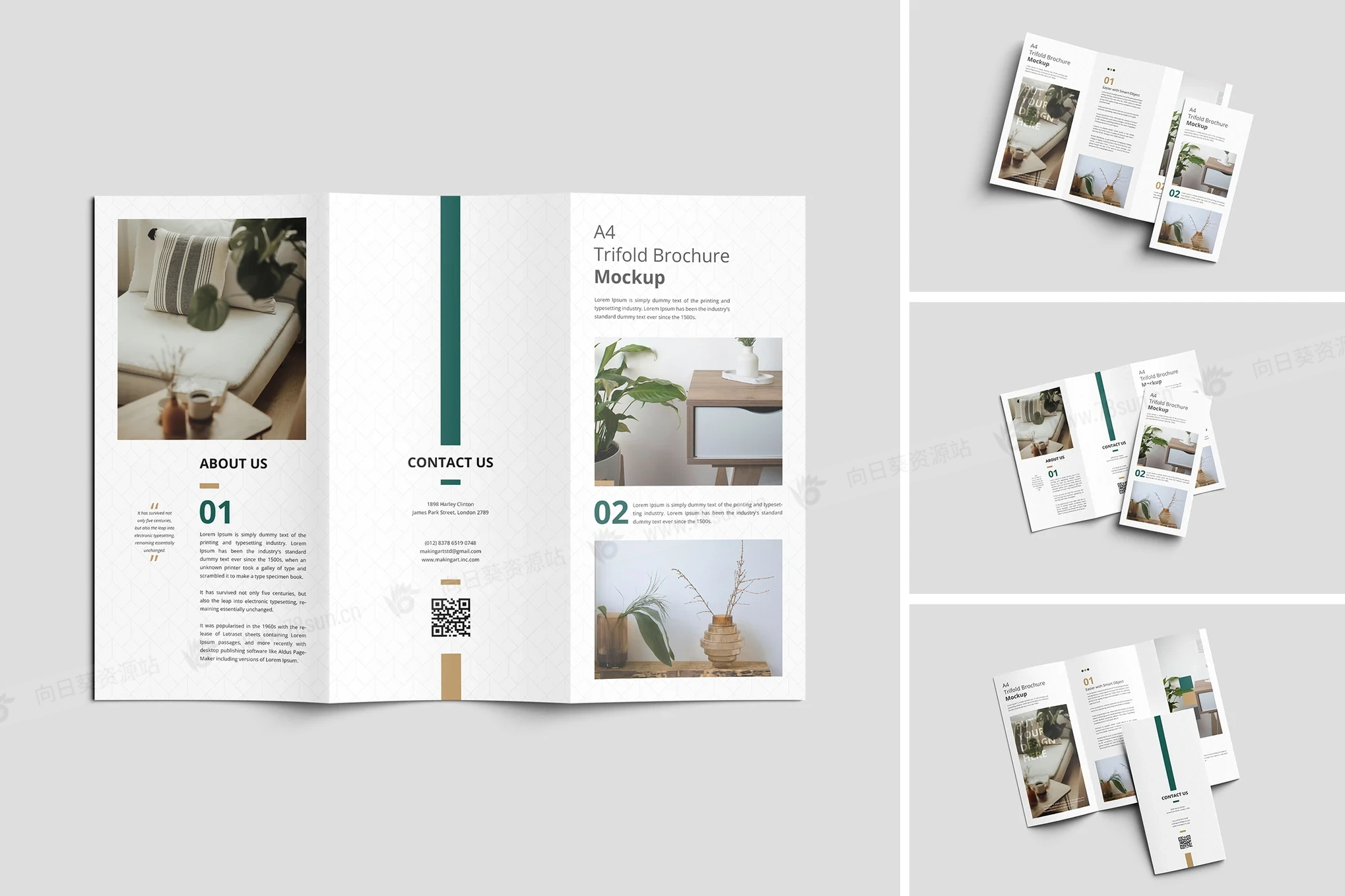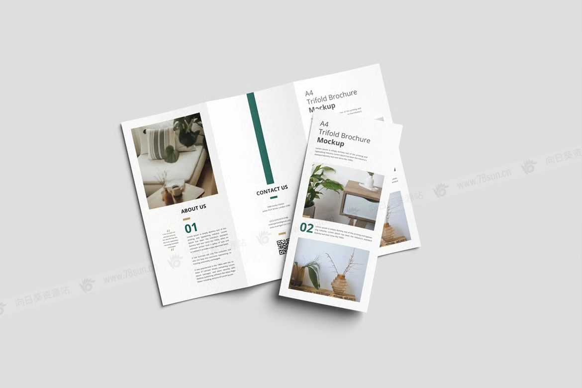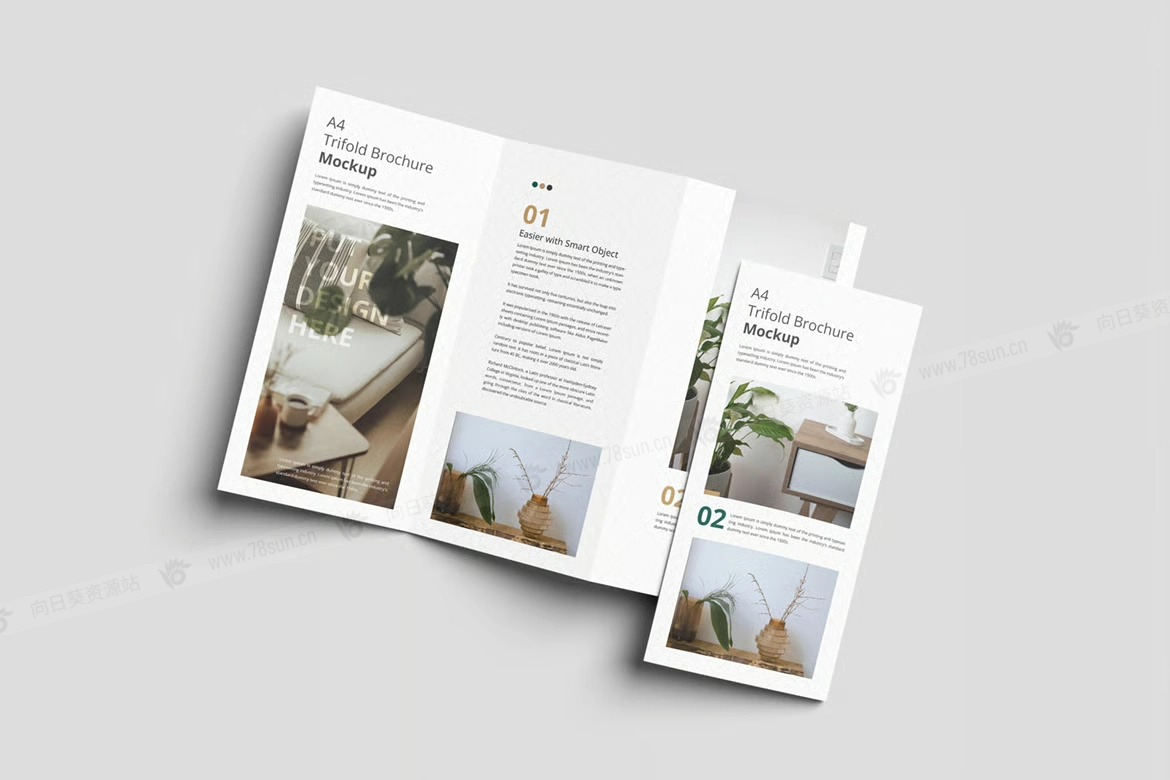 三折页产品宣传小册子品牌VI效果图展示智能贴图psd设计样机。只需用智能物件拖拽设计,即可轻松定制。