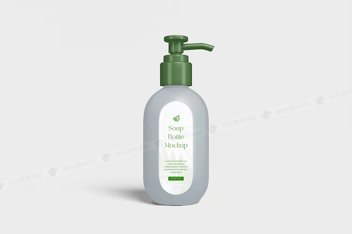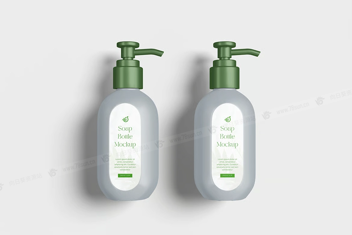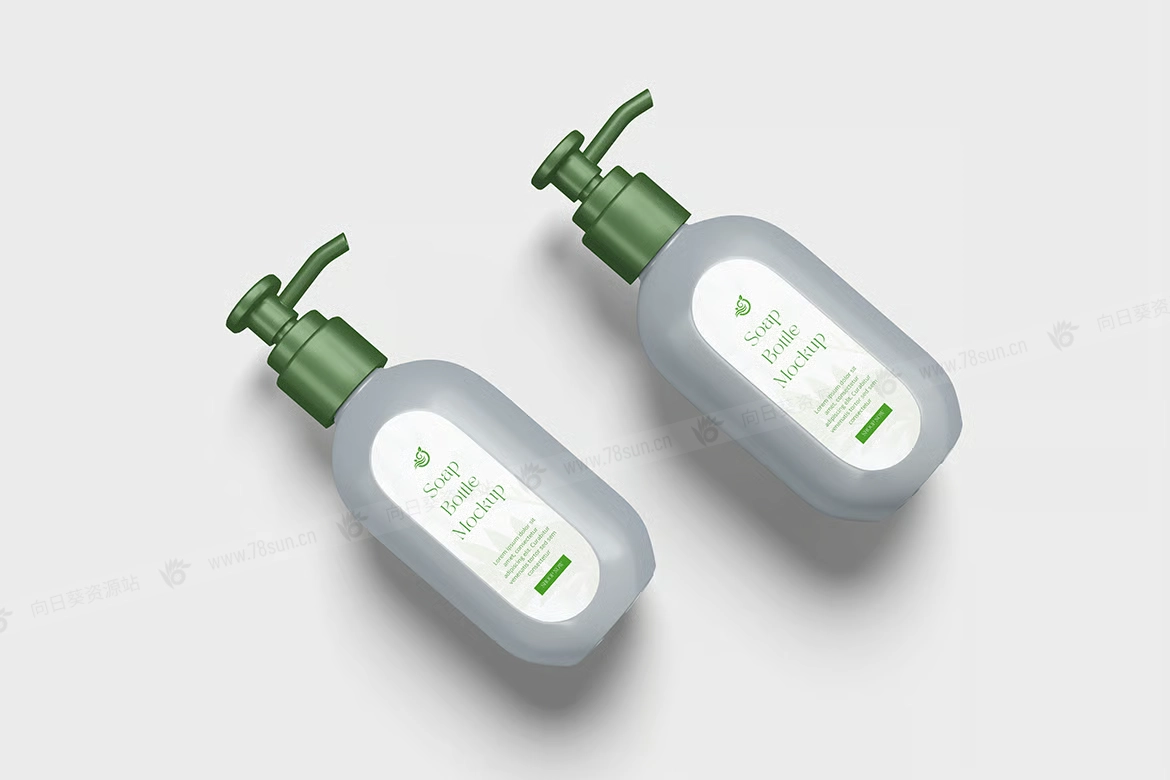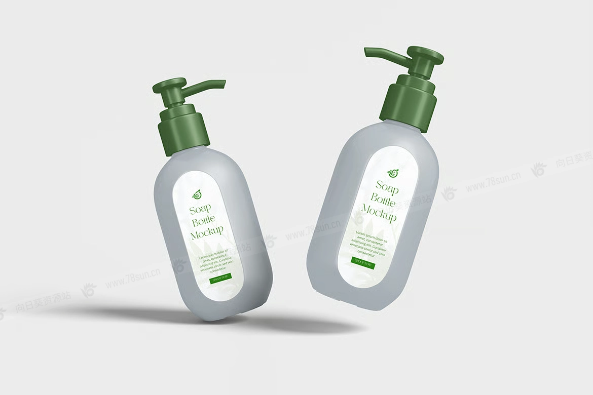 化妆品泵瓶塑料瓶品牌VI效果图展示智能贴图psd设计样机。你可以用智能物体功能轻松快速地替换设计。提供PSD Photoshop格式,并具备智能对象功能,帮助你在几秒钟内用自己的设计替换现有设计。