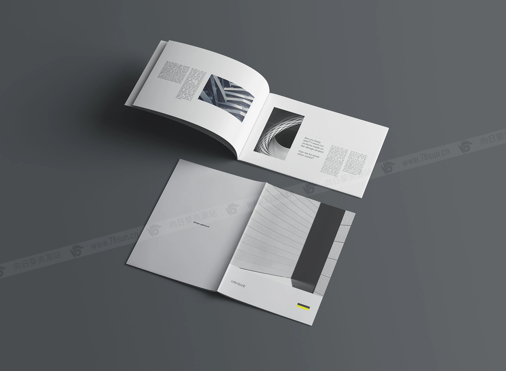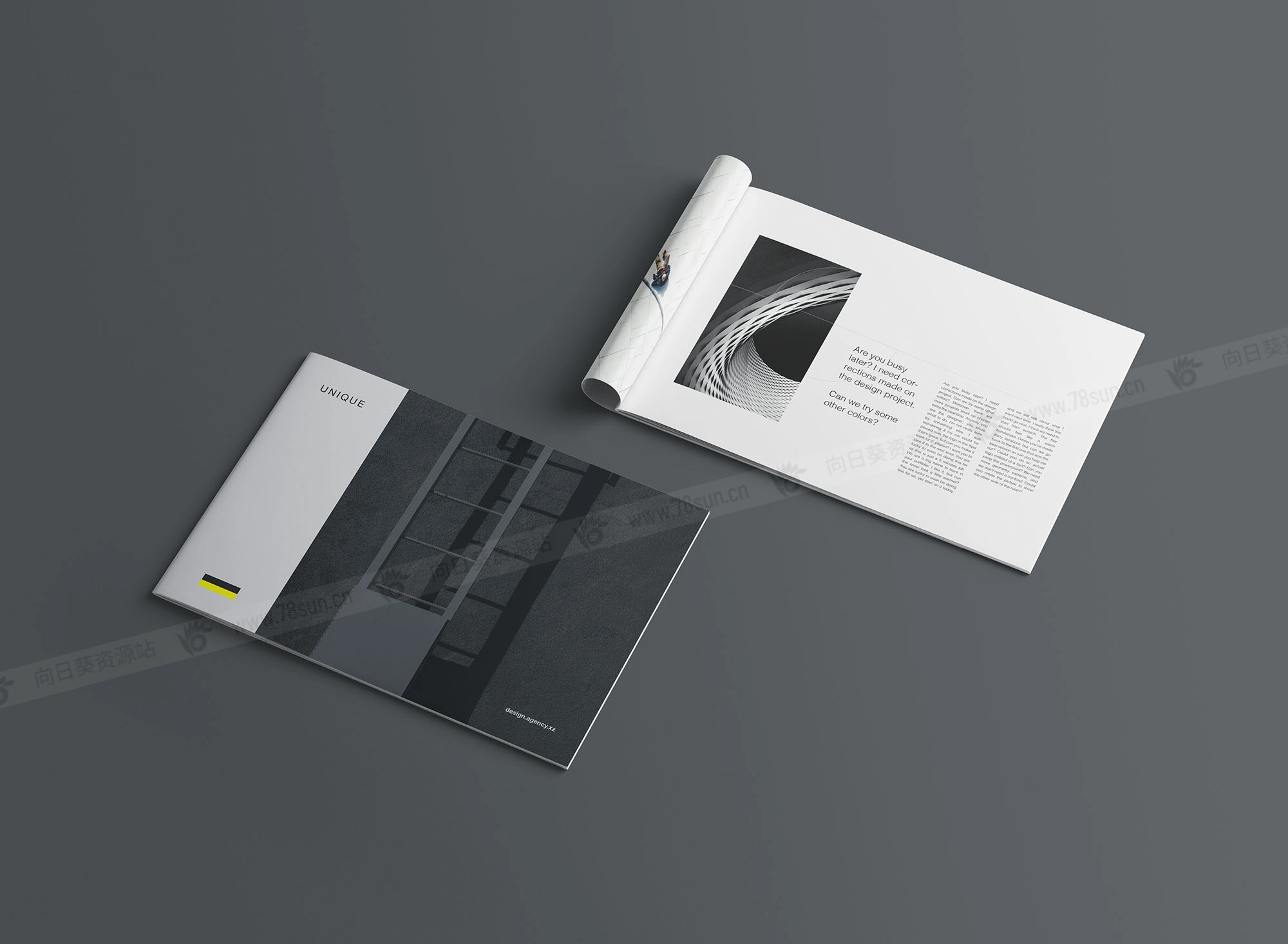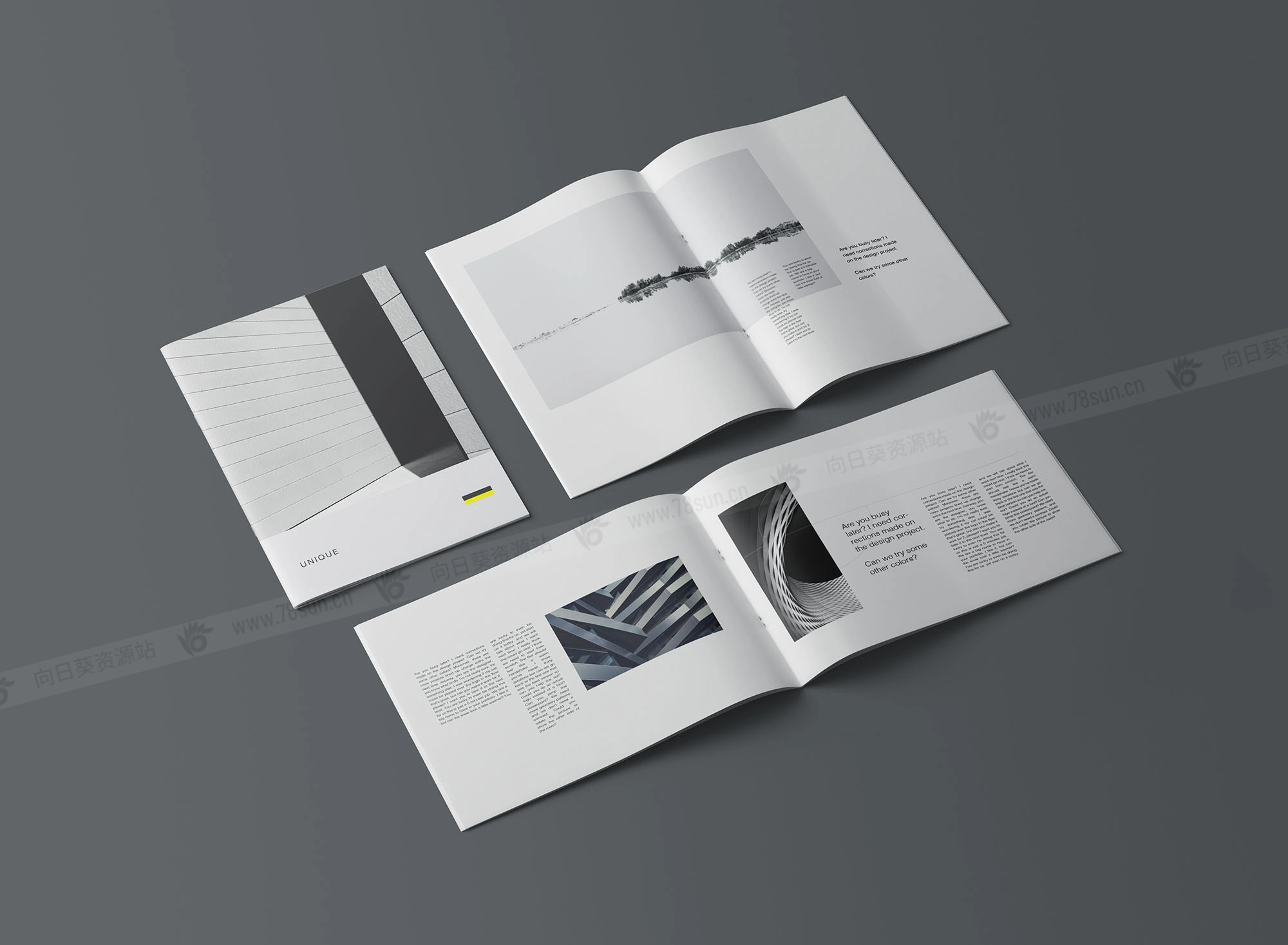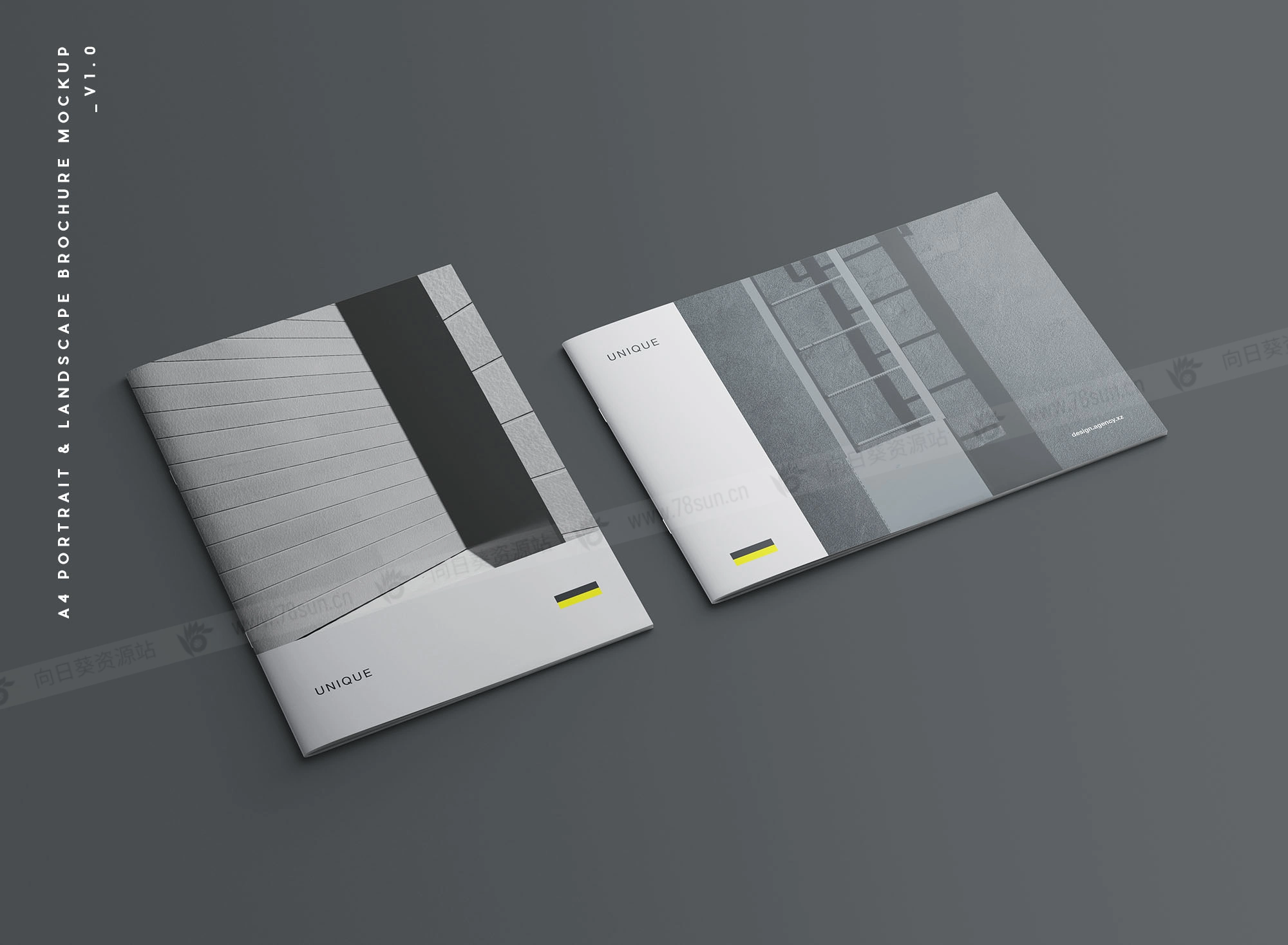 A4宣传册模型,结合了两种取向;直向和横向适合同时展示两种设计选项以便比较。设计师可以利用这一点轻松向客户展示不同的选择。Photoshop文件可以用智能对象图层进行自定义。